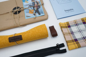 The Kit will include materials needed to craft your own Bagabù Mini Toiletry Bag. In the craft’s box, you will find the outer shell for the bag, lining, zipper, a handle and carefully written instructions. Materials provided are as always - upcycled and sustainable.